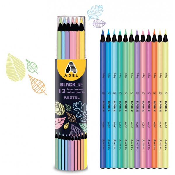12db-os színesceruza készlet pasztel színben. Élénk színek, fekete fa test, törésálló hegy.