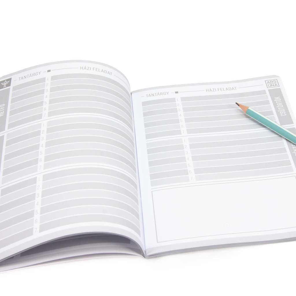 A/5 méretű, 32 lapos leckefüzet, melyben a leckék tantárgyanként napokra bontva rögzíthetők megjegyzésekkel kiegészítve. Borítója 300 gr-os kartonra, 4 szín nyomással, fényes fóliával készült. Belseje 80 gr-os ofszet papír. Méret: 143x214 mm