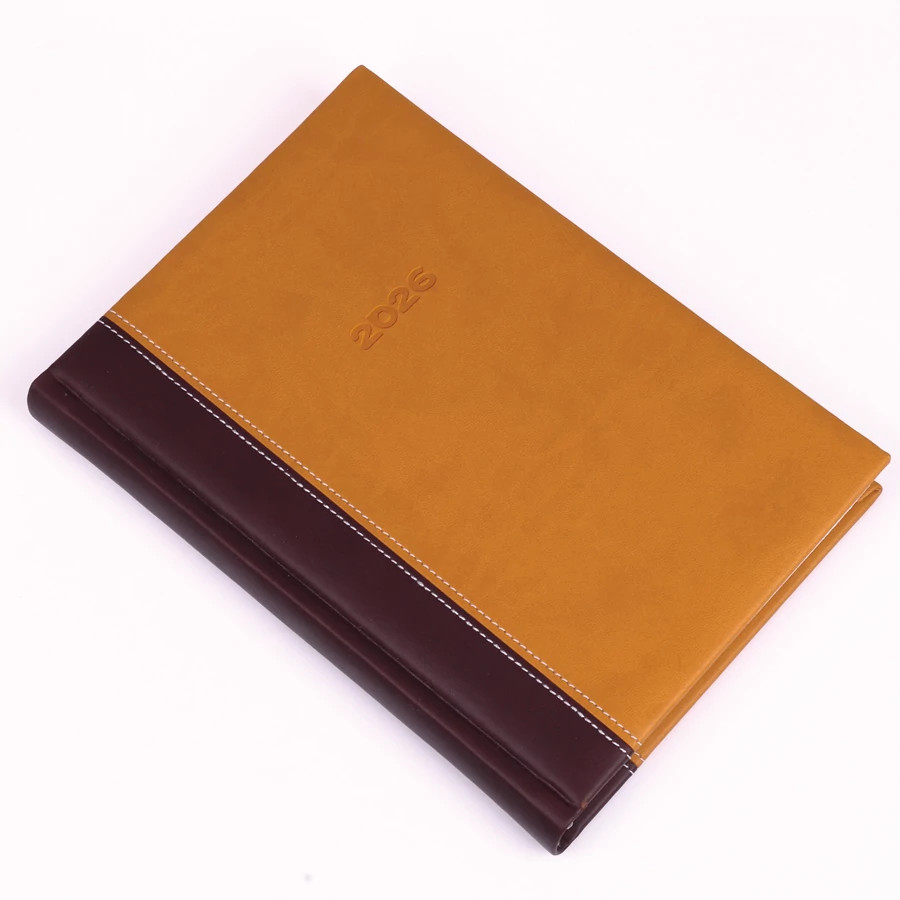 Elől-hátul díszvarrással ellátott matt műbőr peciális színösszeállításban. Napi beosztású, 352 oldalas, 13 hónapos. Extrák: jelzőszalag, sarokperforálás.