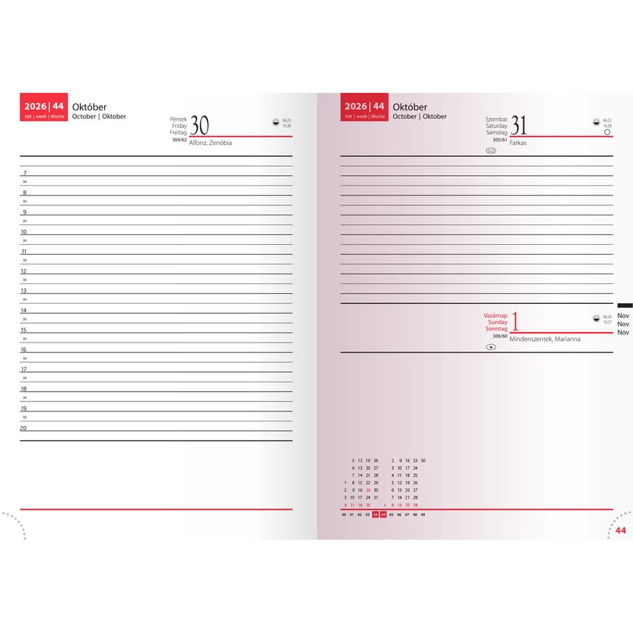 Elől-hátul díszvarrással ellátott matt műbőr peciális színösszeállításban. Napi beosztású, 352 oldalas, 13 hónapos. Extrák: jelzőszalag, sarokperforálás.