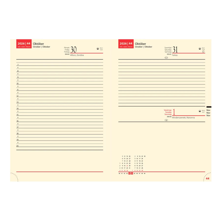 Hőre színeződő matt, varrott műbőr borítás. Napi beosztású, 352 oldalas. Extrák: jelzőszalag, sarokperforálás.