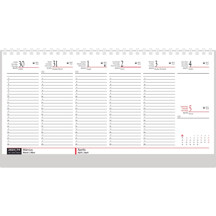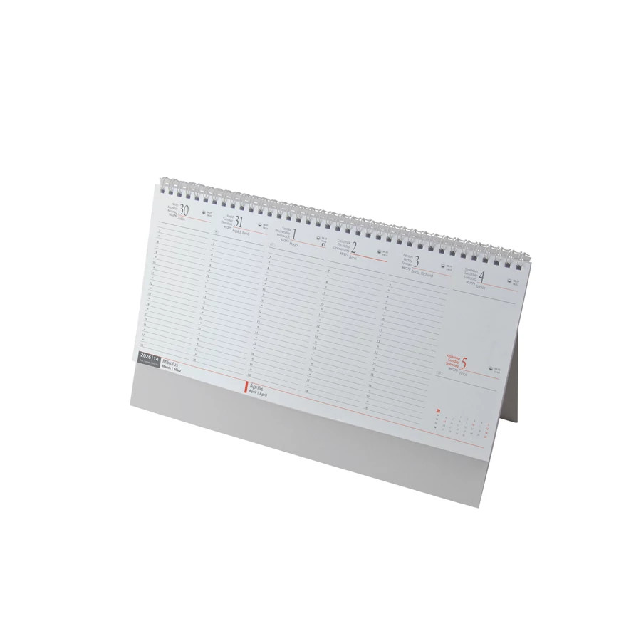 Ikerspirállal összefűzött asztali naptár, heti beosztással. 56 lapos