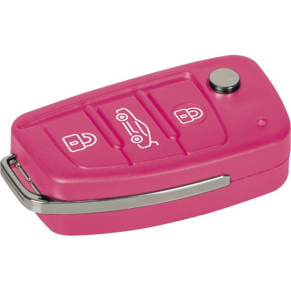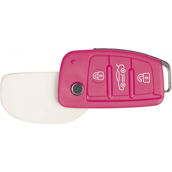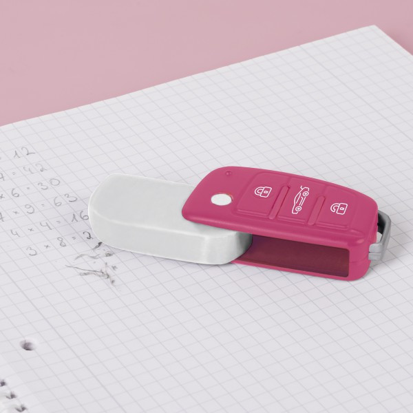 Autókulcs formájú radír rózsaszín / pink műanyag tokban. Kihajtható akárcsak a rendes kocsikulcs. Méretei: 6,5 x 3,5 x 1,5 cm.