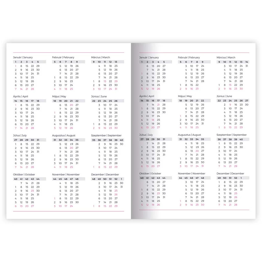 A5 méretű, szivacsos borítójú, napi bontású tervező, havi tervezővel, heti-havi összesítővel, 352 oldal, 148x210 mm