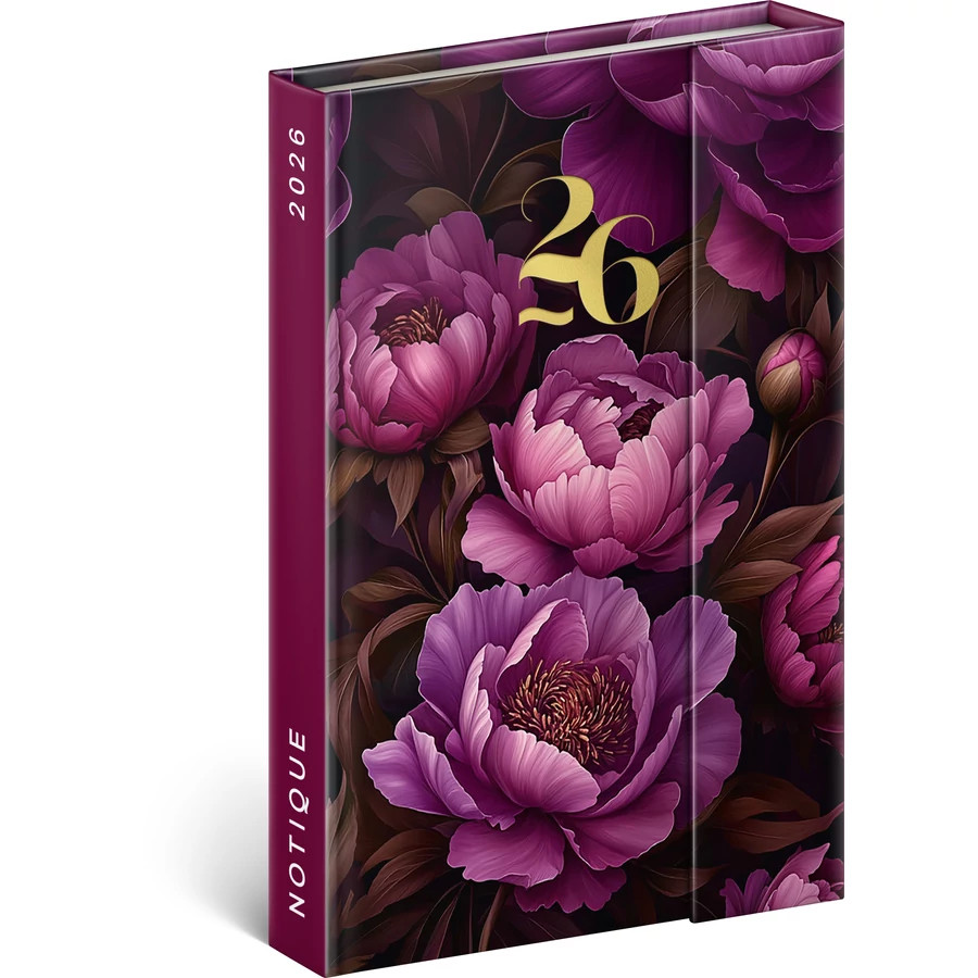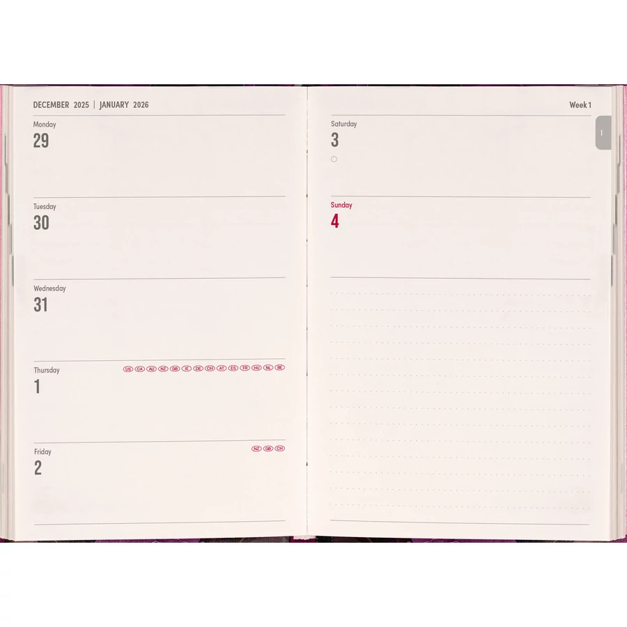 Keménytáblás heti angol nyelvű zsebnaptár mágneszárral. 8 illusztrált oldalt, egy címjegyzéket, információs oldalakat, valamint egy belső zsebet tartalmaz. 144 krémszínű oldal + 8 illusztrált oldal fehér papíron. 16 ország nemzeti ünnepei.