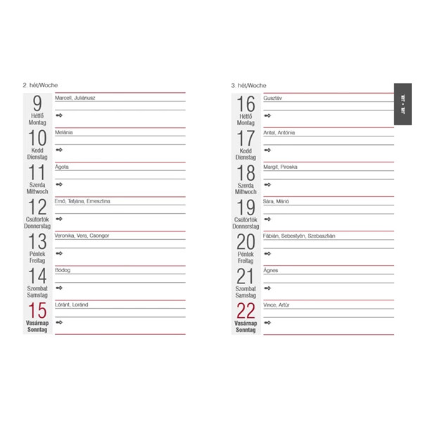 Heti beosztás, fehér papíron, többféle színnel nyomva. 32 oldal szakszöveg, 32 oldal regiszter, színes térképpel. 64 oldal napló, évszámnyomással.