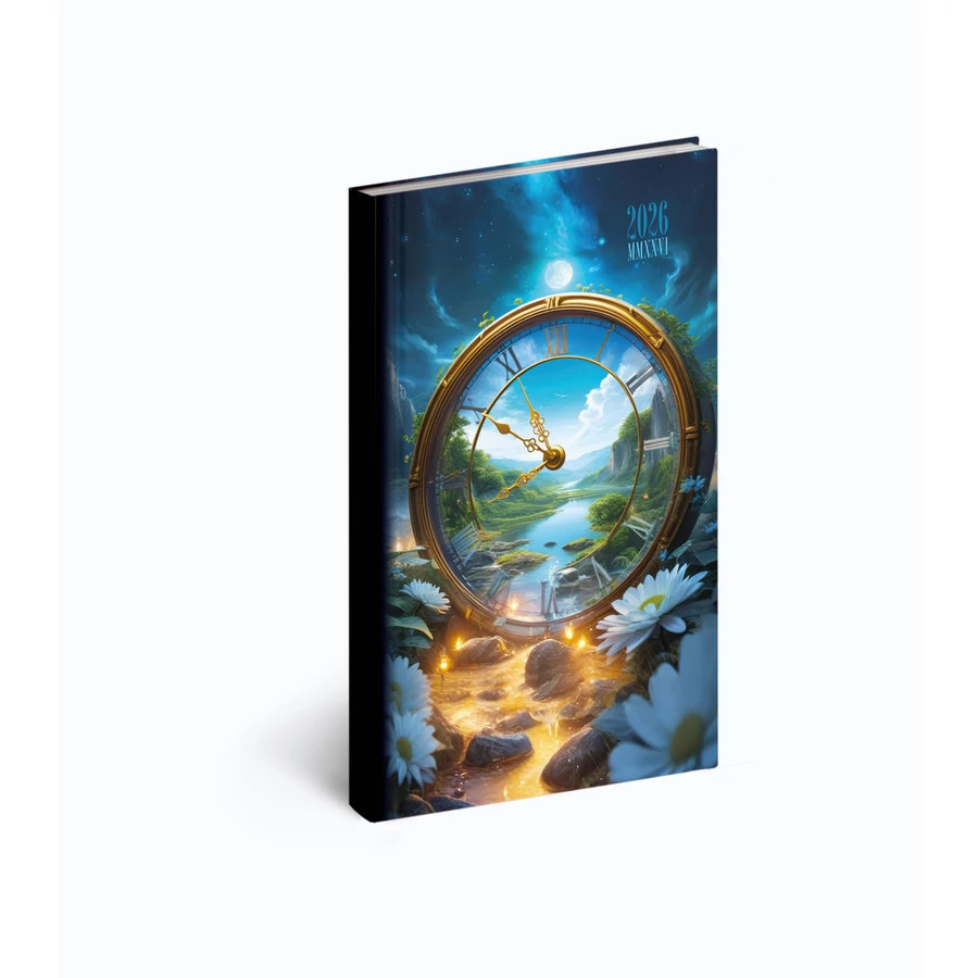 Különböző felületnemesítéssel, illetve fóliával bevont papírborító. Heti beosztású, 144 oldalas, 13 hónapos. Extrák: sarokperforálás.