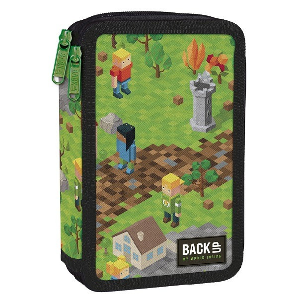 A BackUp felszerelt 2 emeletes tolltartó - Game teljes felszereltséggel kapható. A jól ismert építkezős videojáték zöld-barna pixeles színvilága jelenik meg a tolltartó minden oldalán. Az iskolás fiúknak készült különleges tolltartó tartalma: 3 db golyóstoll, 1 db grafit ceruza, radír, hegyező, vonalzó, 18 db színes ceruza, 18 db filctoll. A menő mintázatú BackUp tolltartóval az asztalon minden tanóra vidáman indul!