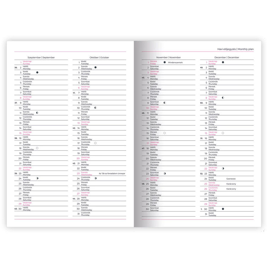 B5 méretű, szivacsos borítójú, heti bontású tervező, heti tervezővel, heti-havi összesítővel, 144 oldal, 165x240 mm